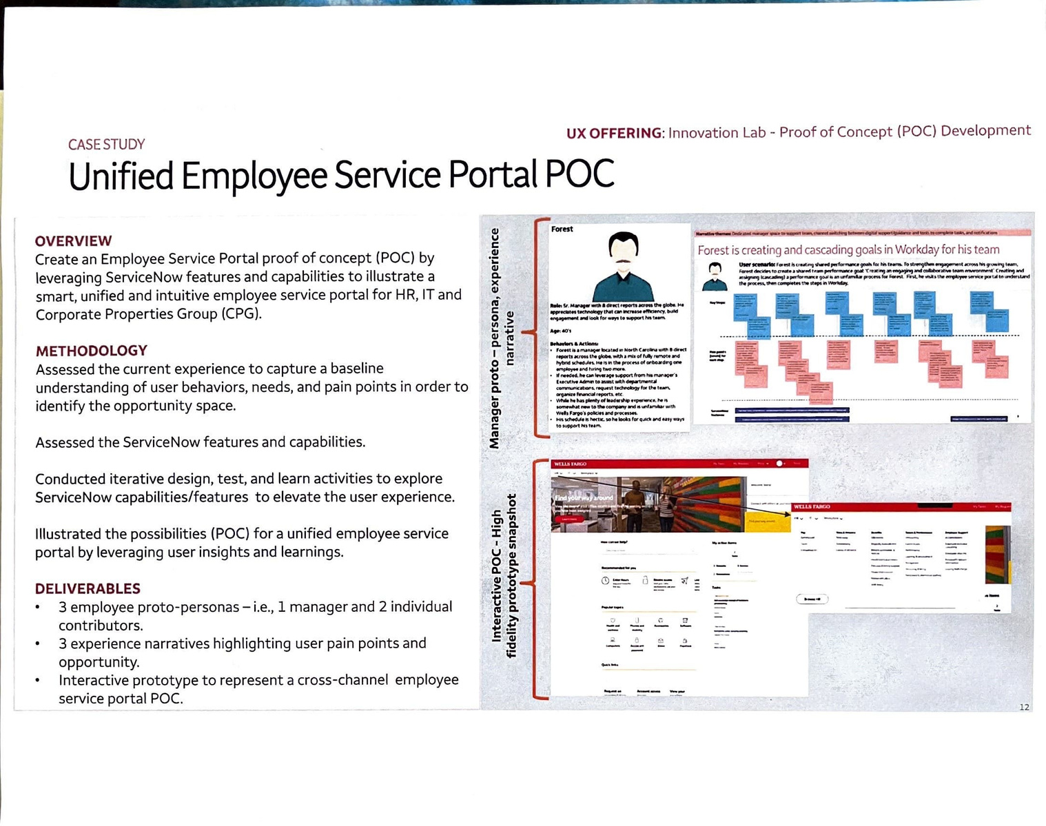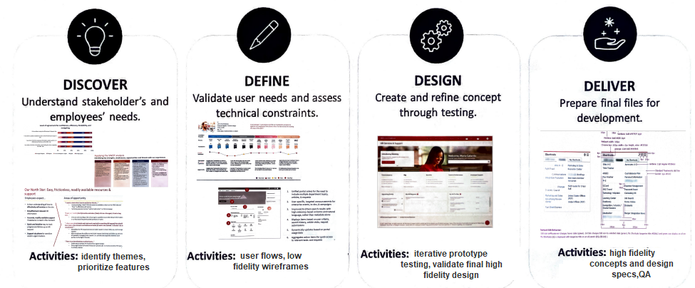 Results : Followed a UCD, double-diamond approach to assess current state employee experience and design a unified service portal (POC):